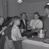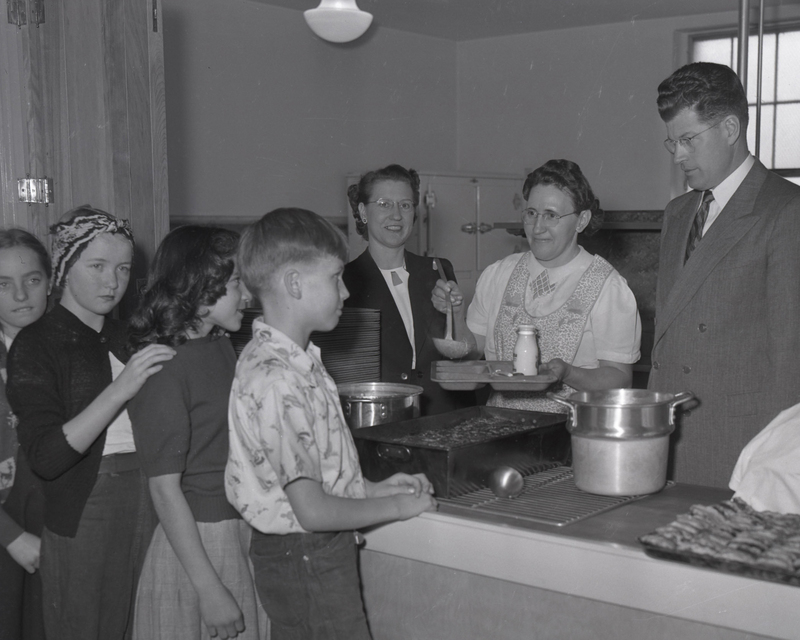 - Among the first to be served in the Ogden city school hot lunch program are two sixth grade students at Hopkins school, Jeneane Schultz and Douglas Allen. Serving is Della Stauffer, cook. Attending are Mrs. M. R. Campbell, P.T.A. president, and Principal Thatcher Handley