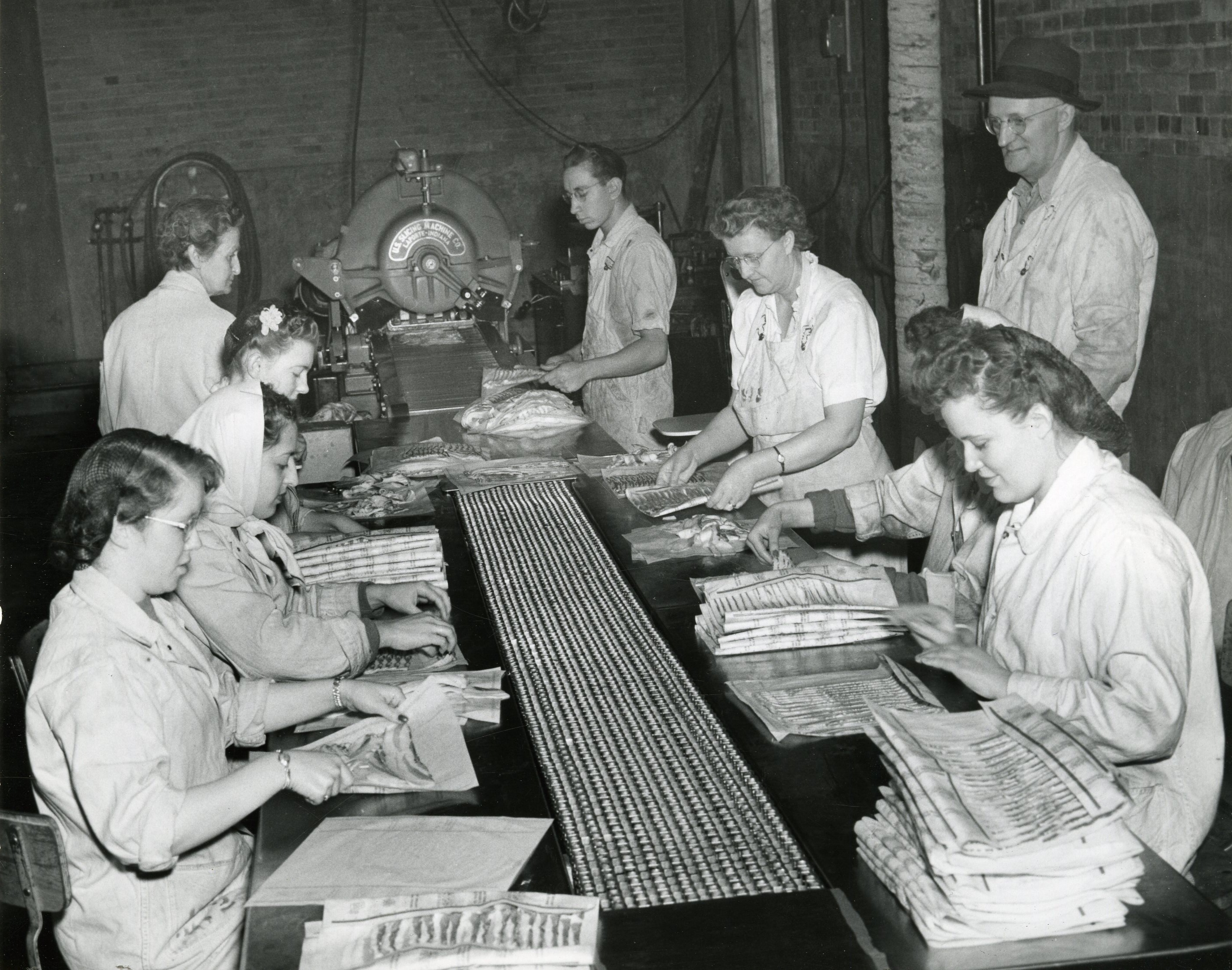 - Workers wrapping bacon at the American Packing and Provision Company